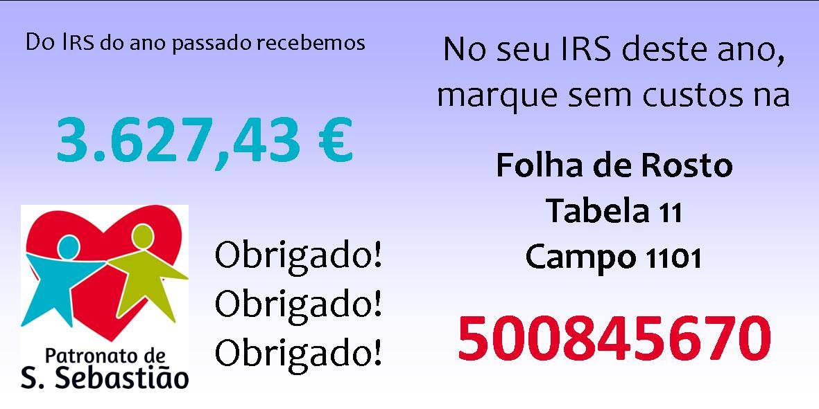 Com pequenas ajudas conseguimos grandes coisas. E esta ajuda é uma delas. Se quisermos, podemos colaborar com o Patronato de São Sebastião quando preenchermos o nosso formulário de IRS e fazer conforme nos dia a imagem junta.